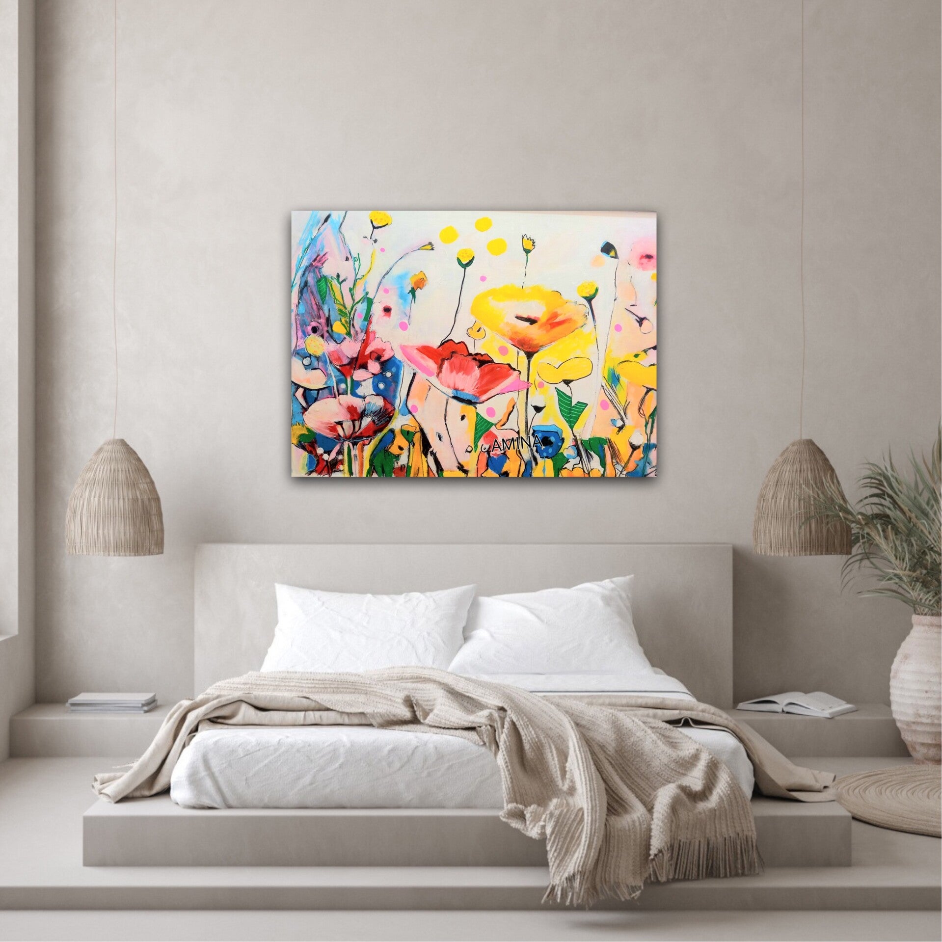 Levering: standaard en zonder extra kosten worden (in Nederland) de schilderijen van Amina rechtstreeks geleverd naar het door jou op te geven adres. Wil je liever dat wij i.p.v. een koeriersdiensten het schilderij komen brengen en wellicht wil je geholpen worden met het ophangen, neem dan vooraf de aankoop contact met ons op, dit kan met een WhatsAppbericht op 0633624806 of via ons contactformulier. Samen willen wij ervoor zorgen dat jij optimaal gaat genieten van jouw nieuwe kunstwerk
