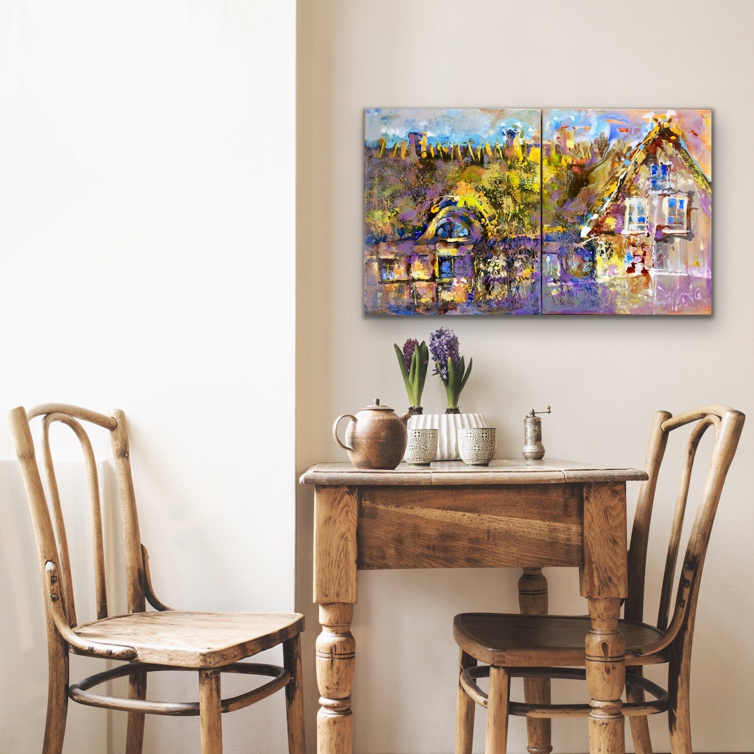 Beschrijving: "Nostalgia" — Een oud huis met een rieten dak in een dorp, badend in warm zonlicht. De scène straalt comfort, warmte en de vredige charme van het plattelandsleven uit. Het kunstwerk is gemaakt met een volumineuze structurele schildertechniek, met meerdere lagen en rijke, levendige kleuren die diepte en textuur aan de compositie toevoegen.